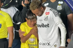 El crack brasileño, como capitán del Peixe, salió primero en la fila de su equipo y acompañado de dos jóvenes que no aguantaron la emoción.